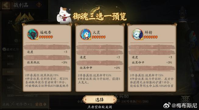 返魂香套装的核心效果体现在两件套和四件套上。前者会为装备者提供30%的抵抗能力,而当集齐四件时,攻击者在造成伤害时有40%的概率使目标陷入眩晕状态,持续一回合。这对于依赖群体aoe技能的式神来说,如雨火流,效果显著。他们的大招会因返魂香的控制效果而大打折扣,对装备者造成的伤害几乎无效。