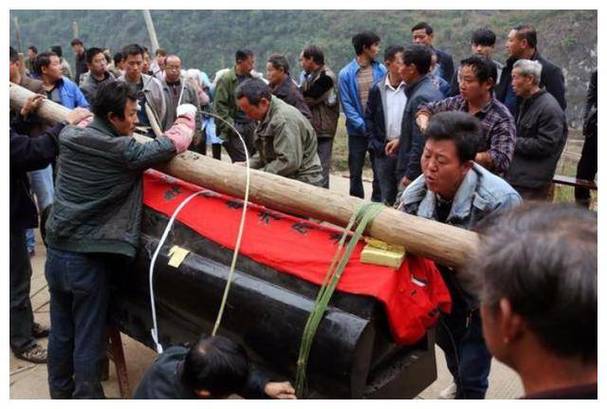 〖壹〗、下葬时,坟坑底要撒上五色粮,棺上头钉要拴上五色线。 孝子们都跪在坟坑脚下,棺材徐徐下葬,接地时要请世亲看看棺齐。 世亲满意后抓一把土撒在棺上,然后众孝子每人抓一把土撒在棺上。 戏班的葬鼓琐呐要吹打起葬乐。 帮忙下葬的人们撤下绳子,把引魂幡立在棺前开始填埋。