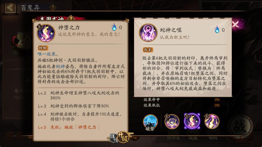 Lv.2每只蛇魔为八岐大蛇及被控制的蛇魔增加30%防御;Lv.3每只蛇魔为八岐大蛇及被控制的蛇魔增加20%效果抗性;Lv.4每只蛇魔使八岐大蛇和控制的蛇魔提升10速度;Lv.5施放后,友方目标获得一个新回合。