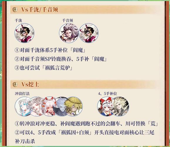 - 茶几的御魂选取:网切或针女。网切能穿透护盾,但爆发不足;针女则无法穿透护盾,但爆发更高。建议根据对手阵容选取。- 辉夜姬选取:涂佛。涂佛辉夜能补充茶几大蛇阵容的不足,使御魂选取更自由。- 大蛇选取:蚌精。双蛇阵容需要两只大蛇,均使用输出御魂,以发挥最大威力。
