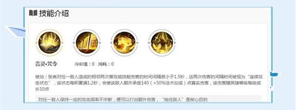 技能解析 被动(言灵·咒印):张良的被动技能决定了他依赖技能连招来造成伤害。因此,装备选取上应偏向降低技能CD和提高技能伤害。一技能(言灵·壁垒):此技能主要用于封锁对方走位,特别是在对方退路上放置,可以眩晕敌人,为二段伤害创造条件。