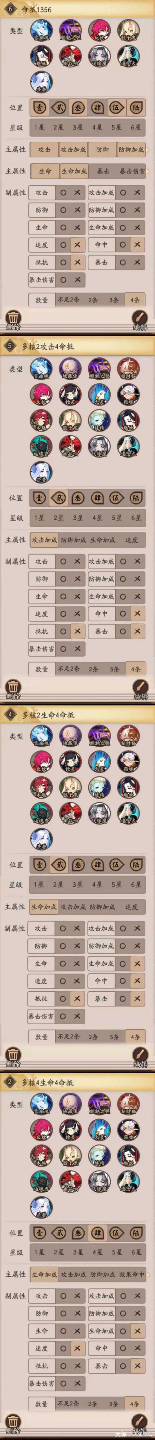三号位副属性为暴击、暴击伤害、生命加成的两件套+15%生命或暴击御魂:适用于治疗和盾系式神过渡期使用。五号位副属性为暴击、暴伤、攻击加成的两件套+15%攻击或暴击御魂:适用于输出式神过渡期。弃置剩余五星御魂:锁完以上御魂后,剩余五星御魂可以弃置,推荐奉纳以获得金币和金蛇皮等物资。