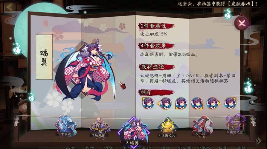 〖肆〗、适用式神:夜叉。蝠翼的4件套效果可以将造成伤害的20%转化为自身生命,对于夜叉这种看脸的输出式神来说,带上蝠翼后可以增加其续航能力。夜叉自身被动的提速效果,可以让他在几番提速后,即使脸不好也能借助速度来慢慢回血慢慢消耗。另类用法:初期或带狗粮的输出式神。