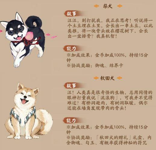 〖叁〗、阴阳师小白猫宠物跟随奖励好,宠物的加成中狸花猫跟柴犬是金币加成,小白猫跟秋田犬是经验加成,最新出的银狐犬是觉醒材料加成。狸花猫、柴犬、银狐犬是给结界卡,小白猫是给大蛇的逆鳞,狗中比较好的是秋田犬给御魂和勾玉脸好的话还给蓝票。