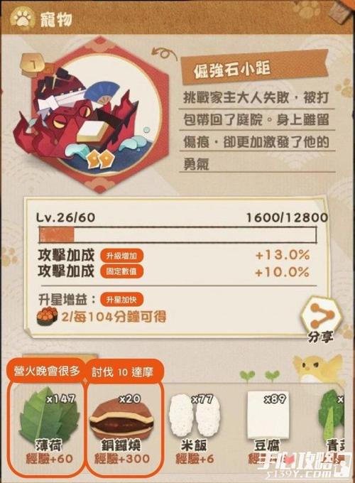 宠物作用介绍 宠物会不定时的给玩家带来一些道具奖励,比如石小距他可以在每66分钟给玩家们带来一点体力储存,玩家们可以到石小距处领取,同时宠物也会给玩家们带来一定的攻击加成,这个加成会随着宠物的等级提升而增加。总结:宠物在阴阳师妖怪屋中是比较重要的一个玩法,玩家们一定要记得没事去给宠物喂食哦。