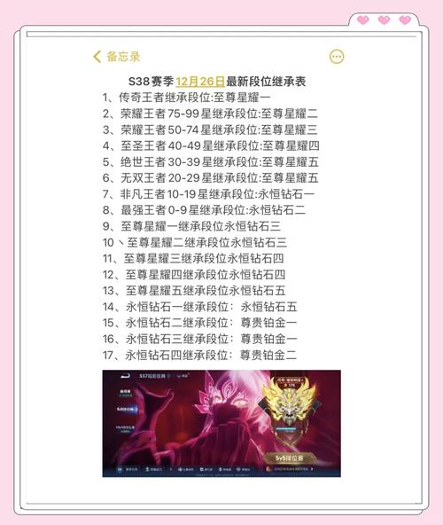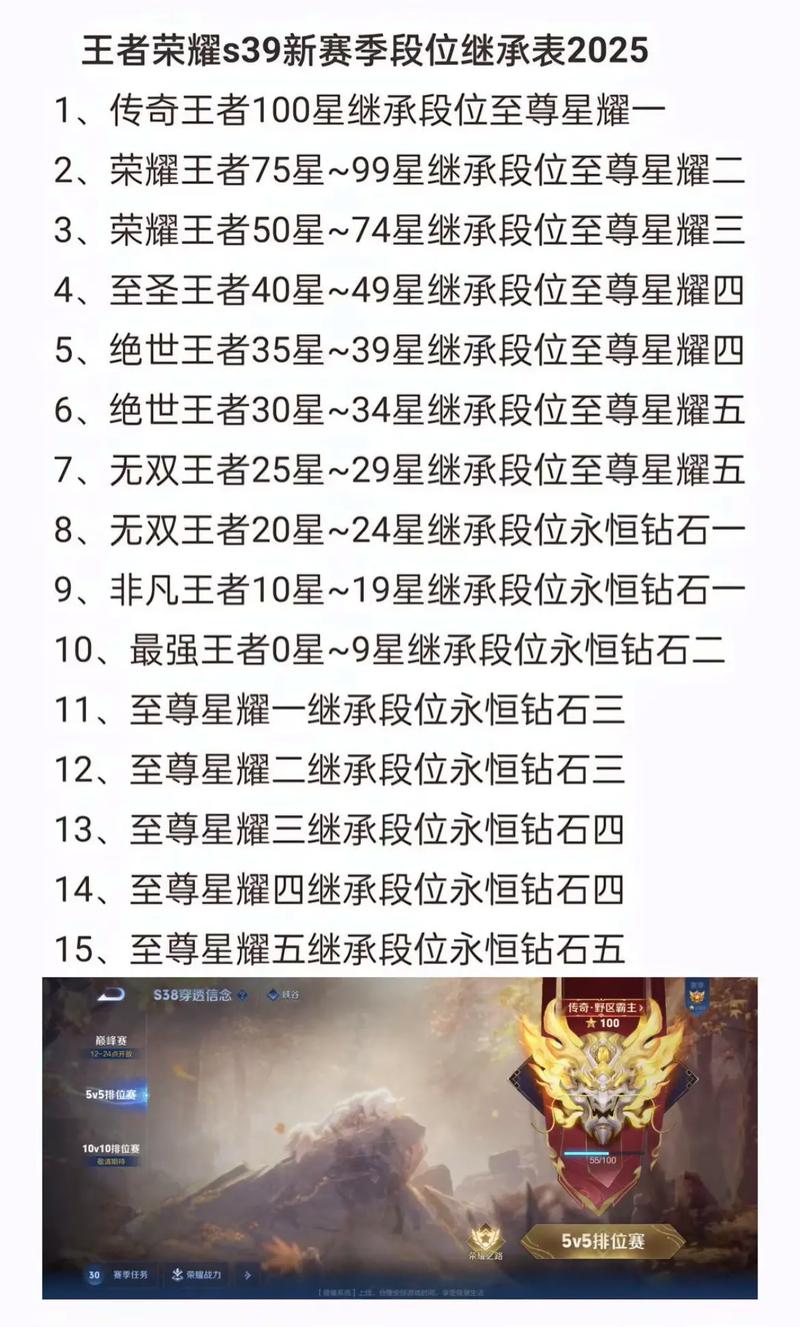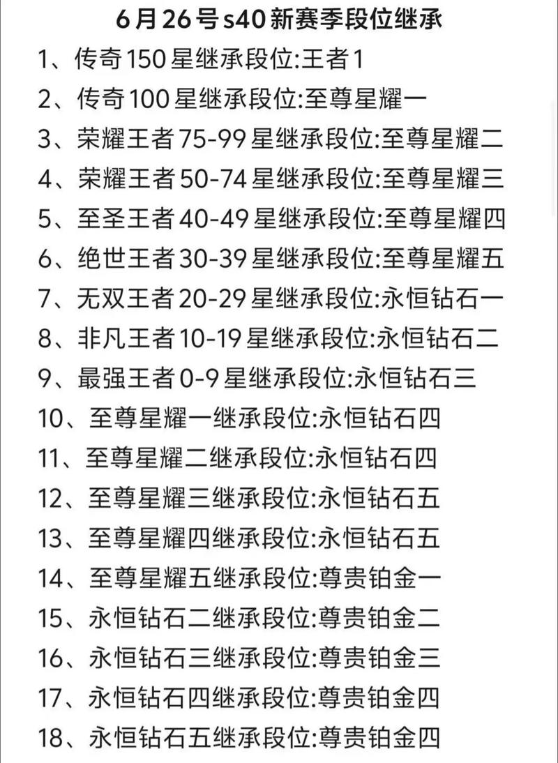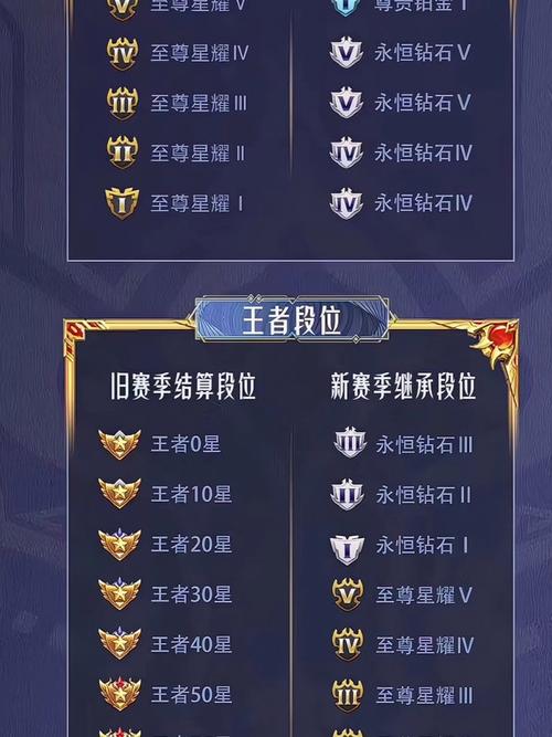 〖壹〗、段位继承表(示例):王者段位: 0-9星 → 继承至钻石Ⅱ或钻石Ⅰ 10-19星 → 继承至星耀Ⅳ 20-29星 → 继承至星耀Ⅲ 30星以上 → 继承至星耀Ⅱ或更高星耀段位:继承至钻石Ⅳ至钻石Ⅰ 钻石段位:继承至铂金或钻石分段 铂金及以下:段位变化较小,通常掉1-2个小段。