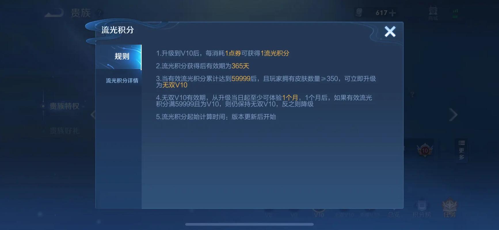 〖伍〗、v10传承皮肤在《王者荣耀》游戏中是永久有效的,没有时间限制。具体来说:永久使用:玩家一旦通过达到v10贵族等级获得了v10传承皮肤,就可以在游戏中的任何时间、任何场景下使用该皮肤,没有使用期限。无时间限制:无论是赛季初、赛季中还是赛季末,玩家都可以自由地使用v10传承皮肤,不受任何时间约束。