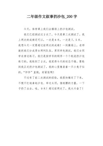 丢沙包200字作文丢沙包是一种充满乐趣的游戏。每当下课铃声响起,同学们便迫不及待地跑到操场上,分组玩起丢沙包。我在中间,沙包像流星一样飞来飞去,我左躲右闪,紧张又兴奋。有时,沙包擦身而过,让我惊出一身冷汗;有时,我眼疾手快,接住沙包,赢得一片欢呼。
