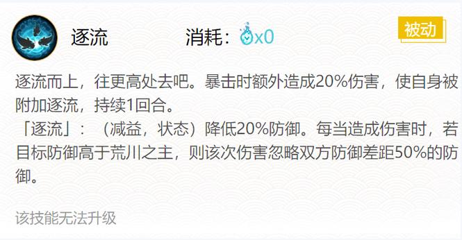 方案一:输出流搭配 御魂选取:破势×4,暴击×2御魂位置:2号位:攻击加成,提升基础攻击力。4号位:攻击加成,进一步增加输出能力。6号位:暴击加成,提高暴击率,增加伤害期望值。点评:此搭配专注于提升骁浪荒川之主的输出能力,适用于斗技等需要高输出的场合。