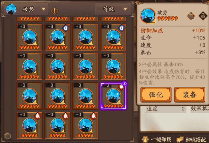 〖伍〗、避免3星御魂:3星御魂的加成较低,即使全部强化到想要的属性,提升也有限。因此,不建议使用3星御魂作为主力或过渡。注意事项 金币管理:非土豪玩家在后期金币会不够用,因此要合理分配金币,避免浪费在不必要的御魂强化上。