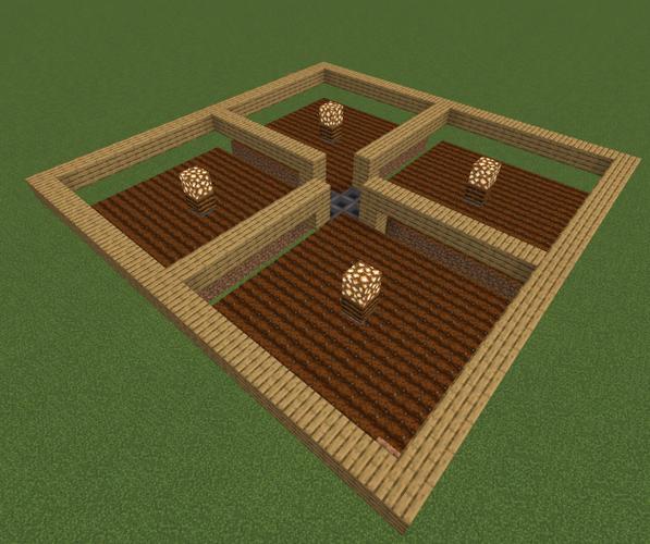 准备一块九乘以九的耕地,并用锄头耕好。在耕地正中央放置水源,并用方块盖住水源以防止村民踩坏耕地。围着耕地建两个高的围墙,并在一侧安装漏斗和矿车收集系统,将漏斗连接到箱子上。安排两个村民,一个作为农民负责种地,另一个为失业村民用于接收作物。