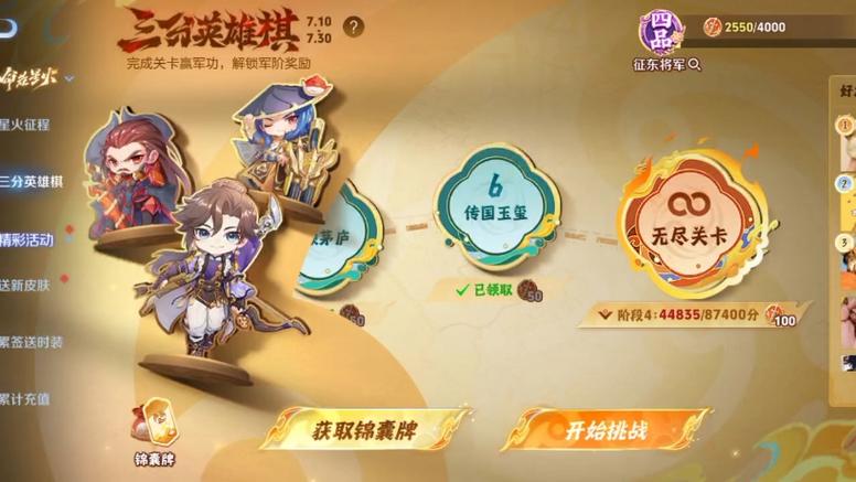 〖贰〗、锦囊选取:必选锦囊如“以逸待劳”“釜底抽薪”能在最终回合爆发高分,“三分天下”则鼓励多阵营混搭,适合无尽模式中持续叠分。羁绊联动:通过灵活换棋和阵营搭配(如魏蜀吴不同组合),触发额外得分效果,延长生存回合。注意事项虽然模式本身无时间限制,但部分活动奖励可能限时获取,需留意游戏内公告。
