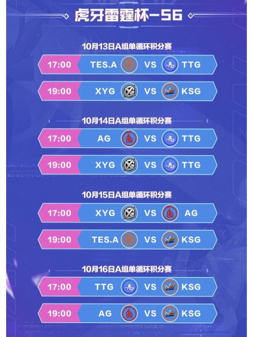 〖肆〗、比赛时间:10月13日至11月20日 参赛队伍:- A组:成都AG超玩会、广州TTG、苏州KSG、长沙TES.A、XYG - B组:重庆狼队、北京WB、佛山DRG.GK、南京Hero久竞、东莞WZ 雷霆杯的首战将由TTG和TES两支以“T”开头的队伍揭开序幕。