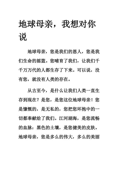 〖肆〗、亲爱的地球妈妈,您是我们的母亲,用无尽的爱和无尽的资源养育了我们,使我们在这片土地上幸福成长。我们感谢您,感谢您赋予我们生命,给予我们一个可以自由呼吸、快乐生活的家园。如果您是月亮,那么我们就是星星,您温柔的光照洒在我们身上,带我们成长。