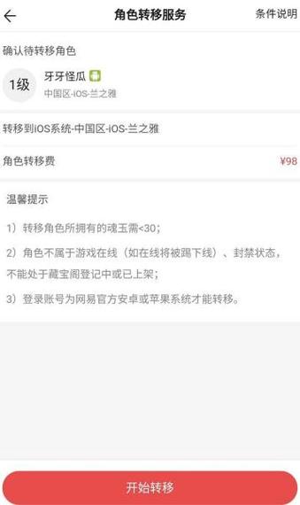 〖陆〗、登录账号及角色所属账号为手机账号或邮箱账号;登录账号为网易官方安卓或苹果系统才能转移;如果为ios角色转移到安卓,转移角色需要无游戏中订阅内容;满足以上条件的角色账号即可通过官方渠道提交角色转移申请,支付费用98RMB后,在1小时内即可完成转移。