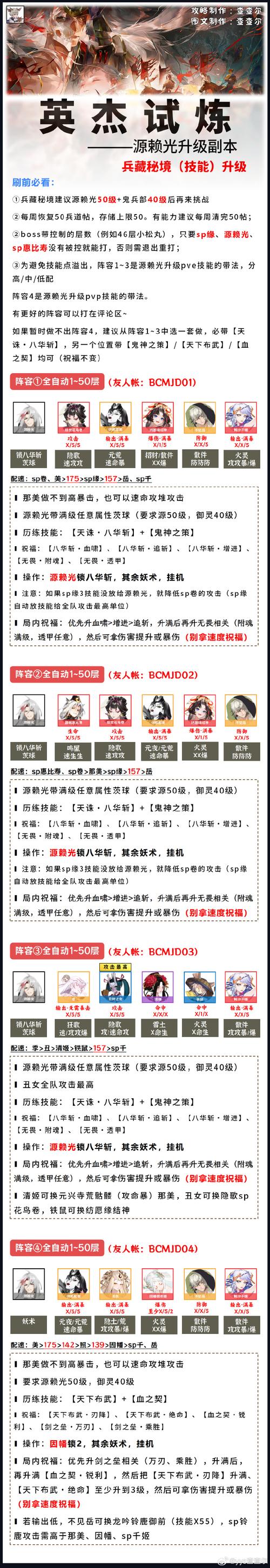 〖贰〗、御魂阵容搭配 配速:小袖之手岚(SP山风)缚姬源赖光(170速)丑女不知火。源赖光技能选取征夷神威。御魂搭配:小袖之手:一速,速度越快越好,开局普攻后锁定2技能,确保针线和协战效果不断。岚(SP山风):高速轮入道,有胧车最优,全程普攻,用于破防boss和草人,绿标套盾保护不知火。