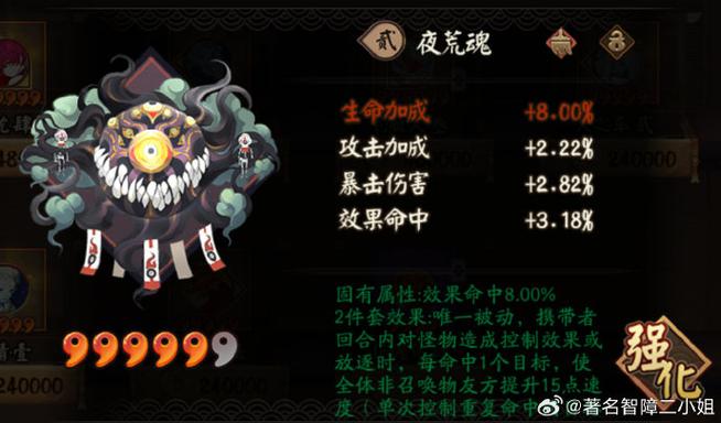 〖贰〗、方案一:针女+2暴击 御魂组合:四件套针女加上任意两件套暴击御魂。针女御魂的效果是,当式神造成暴击时有40%的概率对目标造成其最大生命值10%的伤害,比较高造成自身攻击力120%的伤害。这一效果与荒的多段攻击技能非常契合,可以大幅提升其输出能力。
