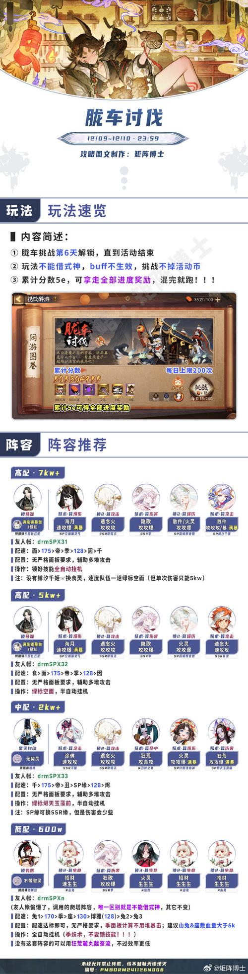 缚骨清姬 全程不放蛇,二次三技能 一次普攻即可完全破防胧车。千姬 千姬插旗后普工,其余式神妖术,标记bosss,晴明先灭后星。帝释天 开局莲花给boss。缘结神 提高阵容续航能力。麓铭大岳丸 大招直接进行输出,对BOSS造成高额伤害。