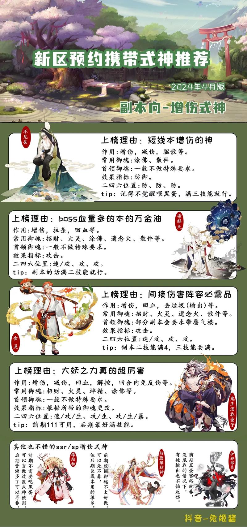 新区携带式神推荐:首先,推荐式神包括千姬、麓铭大岳丸、烬天玉藻前、鬼王酒吞童子。千姬具有广泛适用性,主要功能在于回火增伤,对于秘闻副本和反击场景非常适合。麓铭大岳丸和烬天玉藻前则在pvp和pve中表现均衡,是开荒的好选取。鬼王酒吞童子虽然不是全面性辅助,但如果抽到了SSR千姬,也可以完全替代。